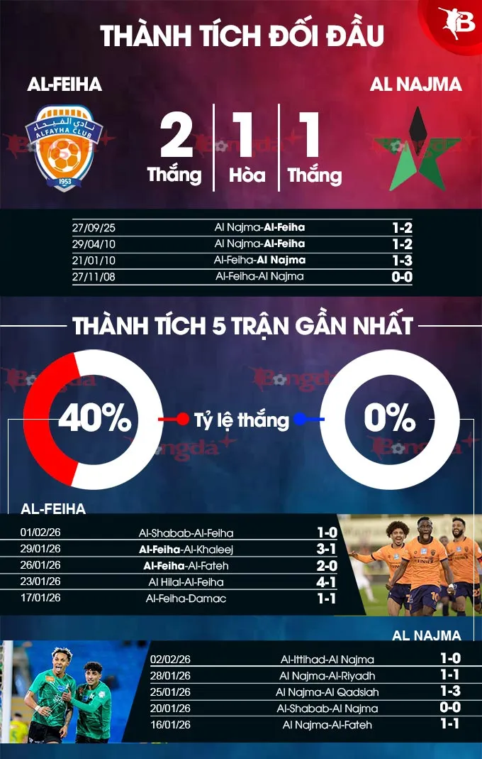 Lịch sử đối đầu cũng không ủng hộ Al Feiha khi họ chưa từng đánh bại Al Najma trong cả hai lần tiếp đón trên sân nhà. Sự kết hợp giữa phong độ trồi sụt và thành tích đối đầu không tốt mở ra cơ hội cho đội khách hướng tới một kết quả có điểm.
