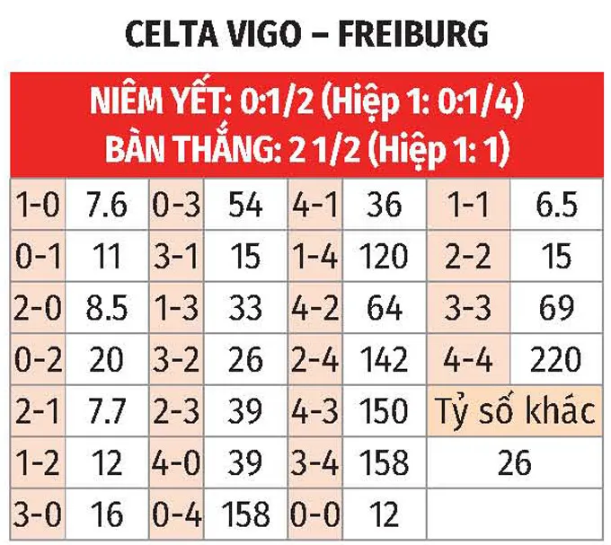 - Cả hai cùng ghi bàn: Celta Vigo đã ghi bàn trong 8/10 trận gần đây, trong khi Freiburg làm được điều này ở 7/10 trận. Đặc biệt, Celta Vigo luôn tìm thấy lưới đối phương trong 9/10 trận sân nhà gần nhất. Xu hướng này cho thấy khả năng cao cả hai đội sẽ cùng có bàn thắng.