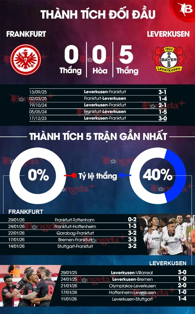 Lịch sử đối đầu cũng không ủng hộ Frankfurt. Trong 10 lần chạm trán gần nhất, Leverkusen thắng tới 8, chỉ để thua 2. Đặc biệt, 2 lần gần đây nhất làm khách trên sân của Frankfurt, Leverkusen đều ra về với 3 điểm trọn vẹn. Với tất cả những dữ liệu này, cửa thắng nghiêng hẳn về phía đội khách.