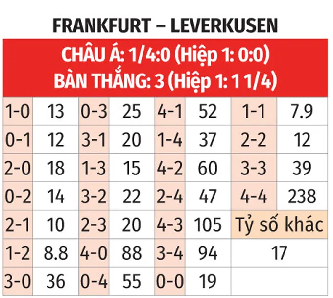 - Tổng số bàn thắng chẵn: 6/10 trận đối đầu gần đây giữa hai đội có tổng số bàn thắng là số chẵn. Xu hướng này cũng xuất hiện ở 7/10 trận sân nhà gần nhất của Frankfurt và 6/10 trận sân khách mới đây của Leverkusen.