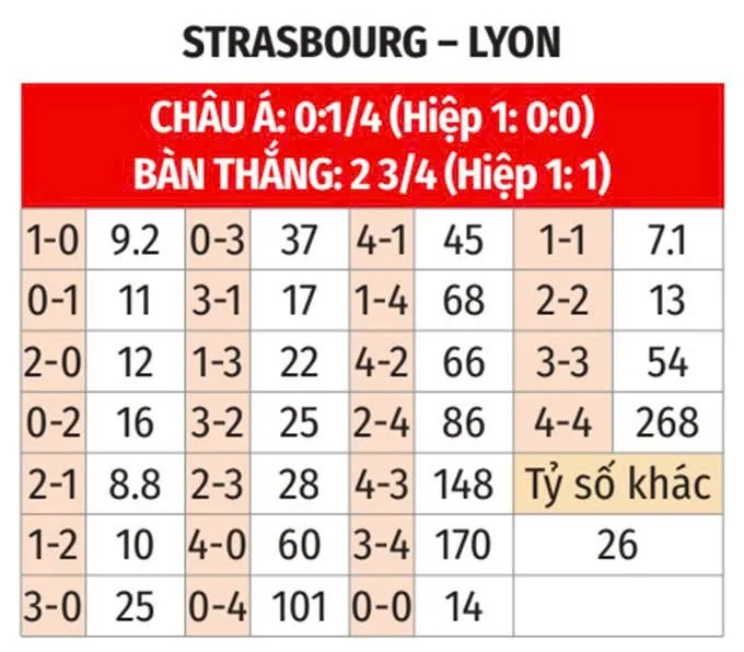 - Xu hướng tổng bàn thắng lẻ: 6/8 trận đối đầu gần nhất, 4/5 trận gần đây của Strasbourg tại Ligue 1, và 6/9 trận vừa qua của Lyon đều có tổng bàn thắng là số lẻ. 4/5 chuyến làm khách gần nhất của Lyon cũng chứng kiến kết quả tương tự.