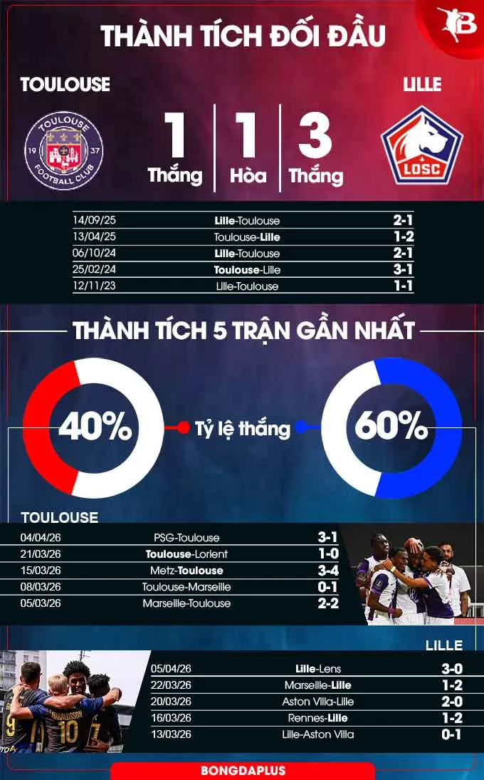 Mặc dù phong độ hiện tại không quá chênh lệch, nhưng với lợi thế về lịch sử đối đầu, phong độ sân khách ổn định và động lực tranh vị trí cao, Lille được đánh giá cao hơn trong việc rời sân Stadium de Toulouse với 3 điểm.