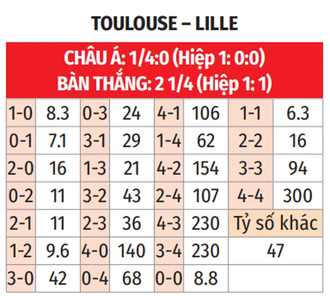 - Xu hướng bàn thắng lẻ: 6/9 trận đối đầu gần nhất giữa hai đội kết thúc với tổng bàn thắng là số lẻ. Điều này cũng tương đồng với 7/10 trận gần đây của Toulouse và 8/10 trận của Lille.